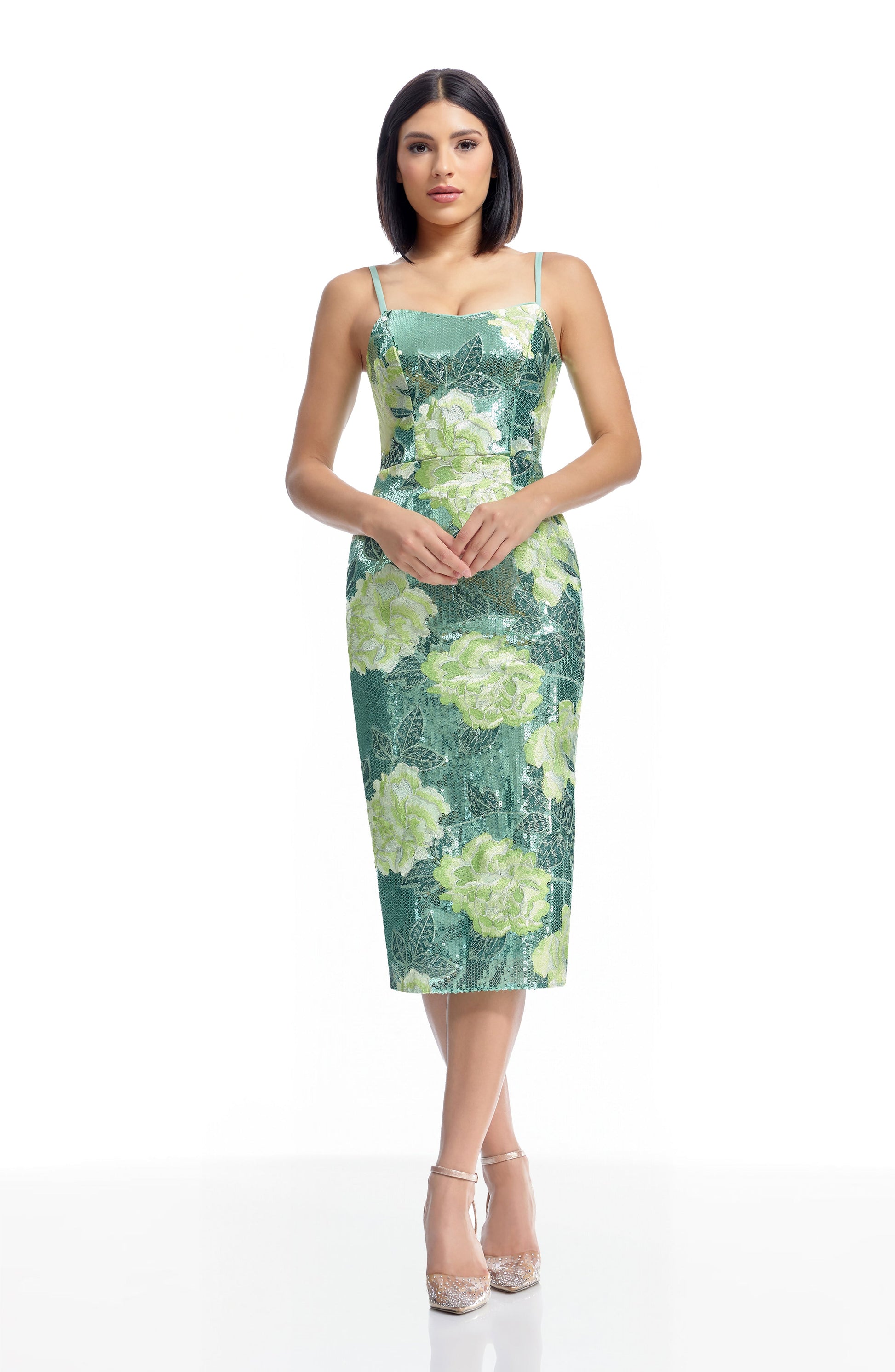 - Floral embroidery over sequins, fully lined in CDC (no stretch), tulle framed to protect wearer's skin from sequin fabric