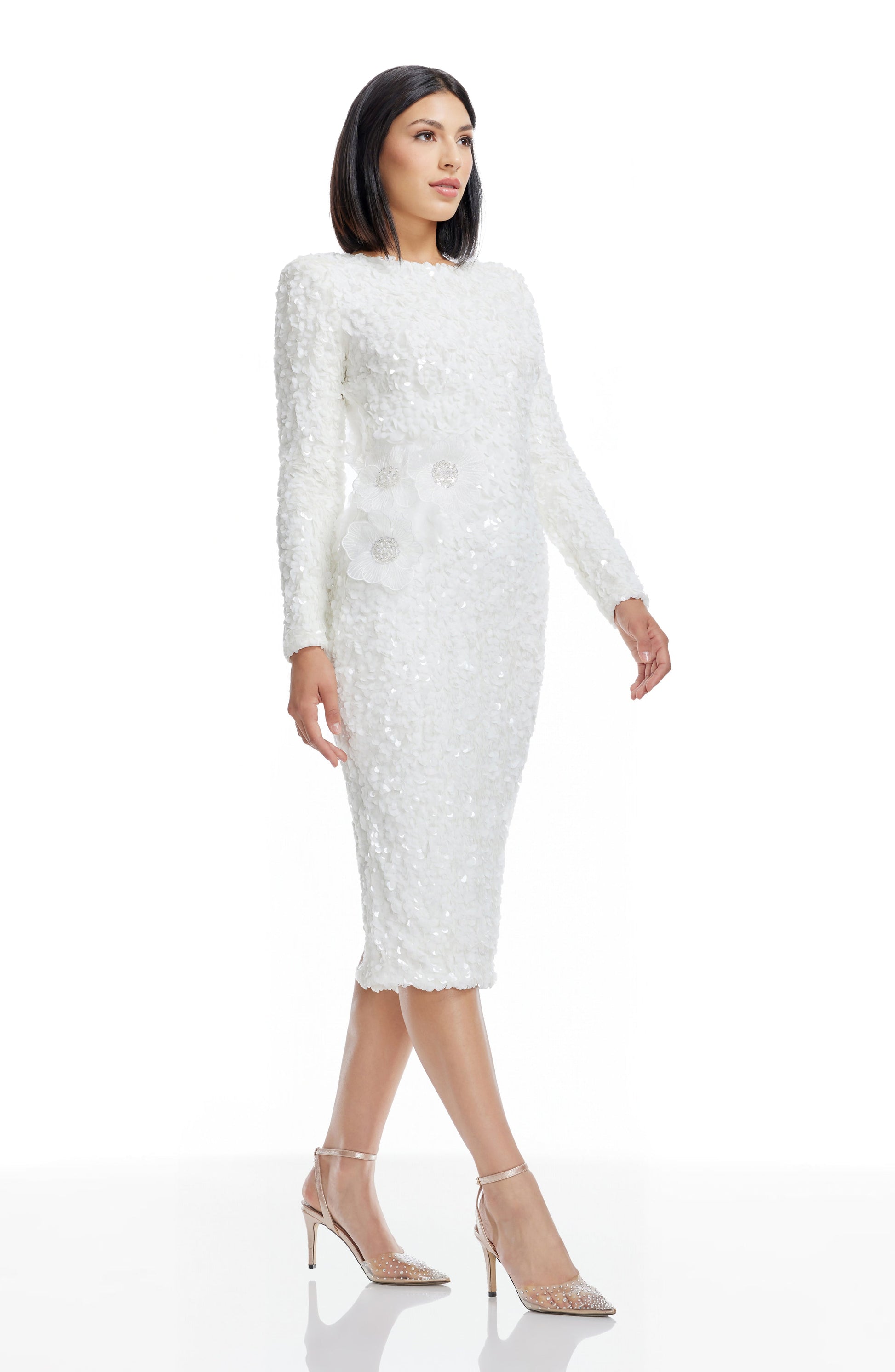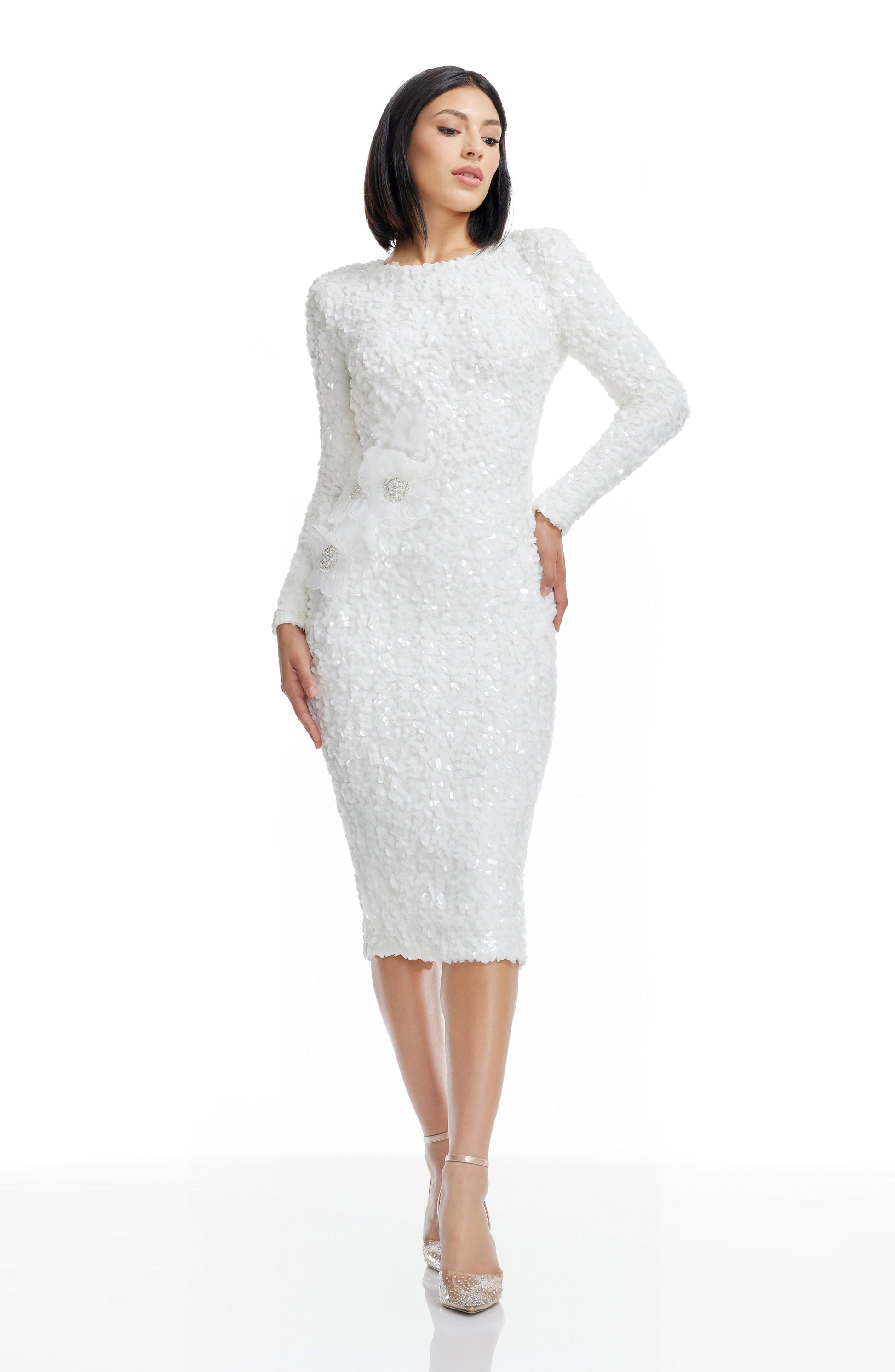The Emmalyn Dress features a round neckline and long sleeves, exquisitely tailored for a flattering bodycon fit. This midi dress will elevate your style with its refined elegance and timeless charm.