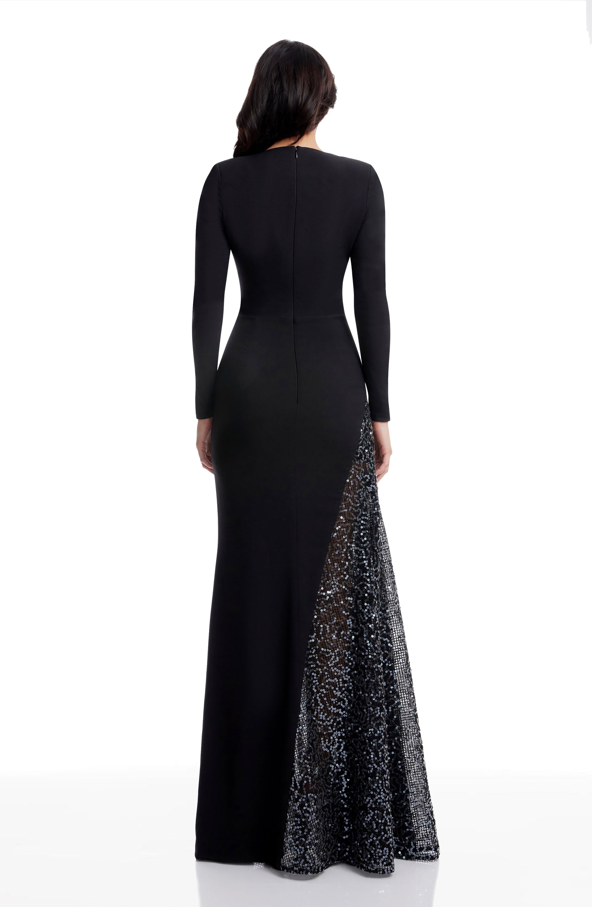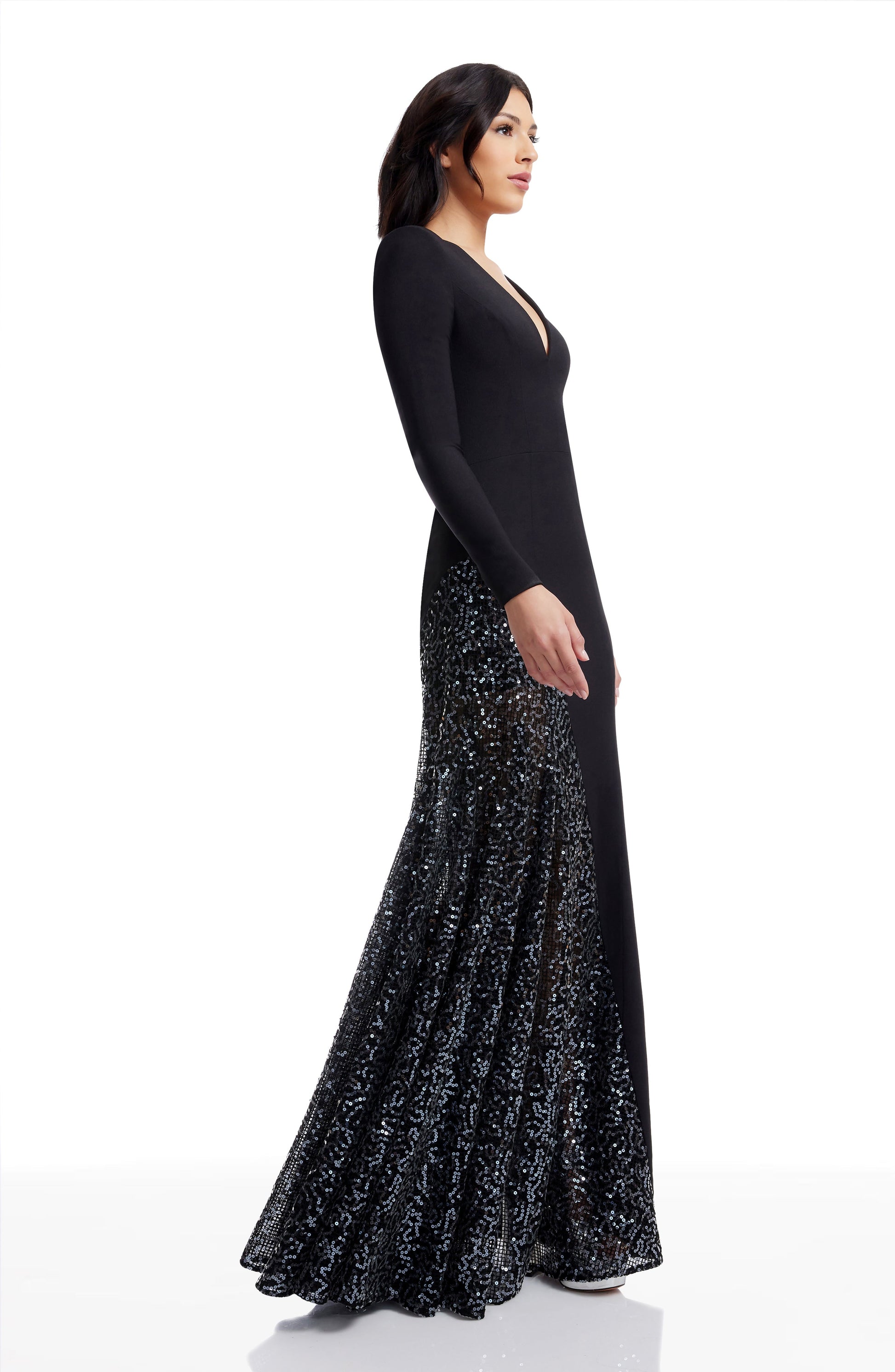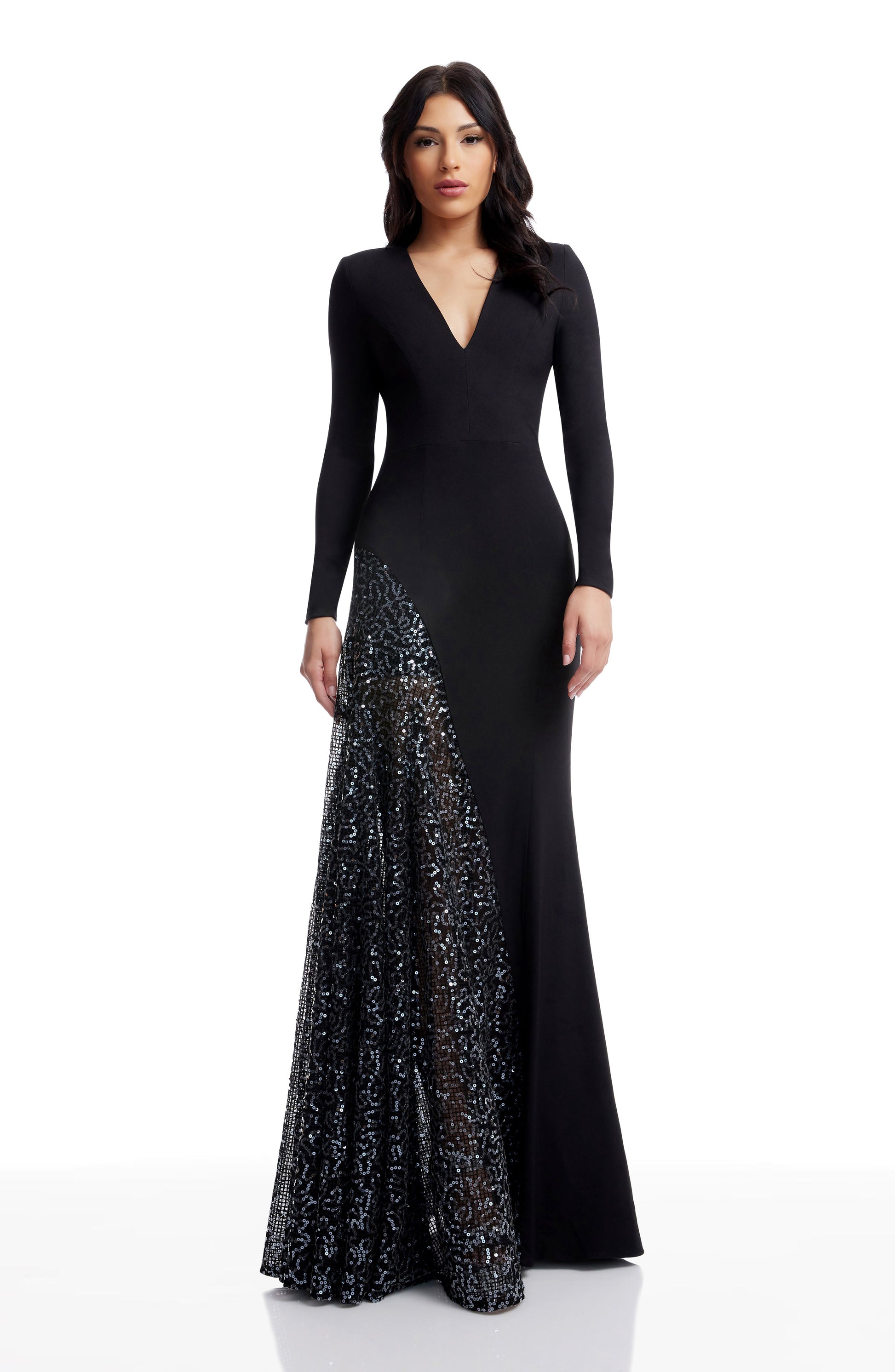 Elegantly designed with a deep V neckline and sheer contrast panel, this long sleeve A-line dress dazzles with delicate micro sequins for a show-stopping look.