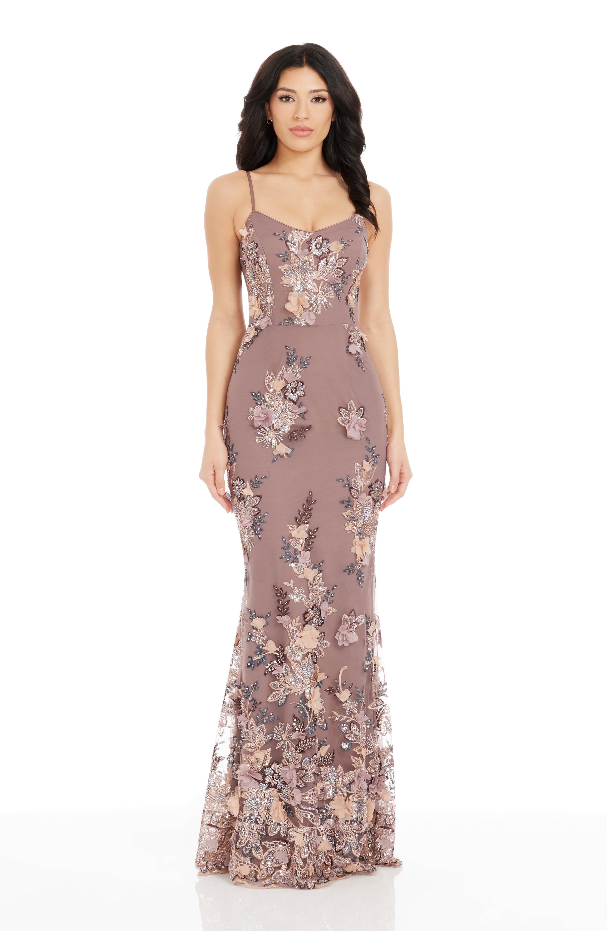 Unveil your inner elegance with the Giovanna dress, an enchanting choice for any formal affair. This floor-length mermaid gown is adorned with exquisite 3D flowers, adding a touch of whimsical beauty to its classic silhouette.