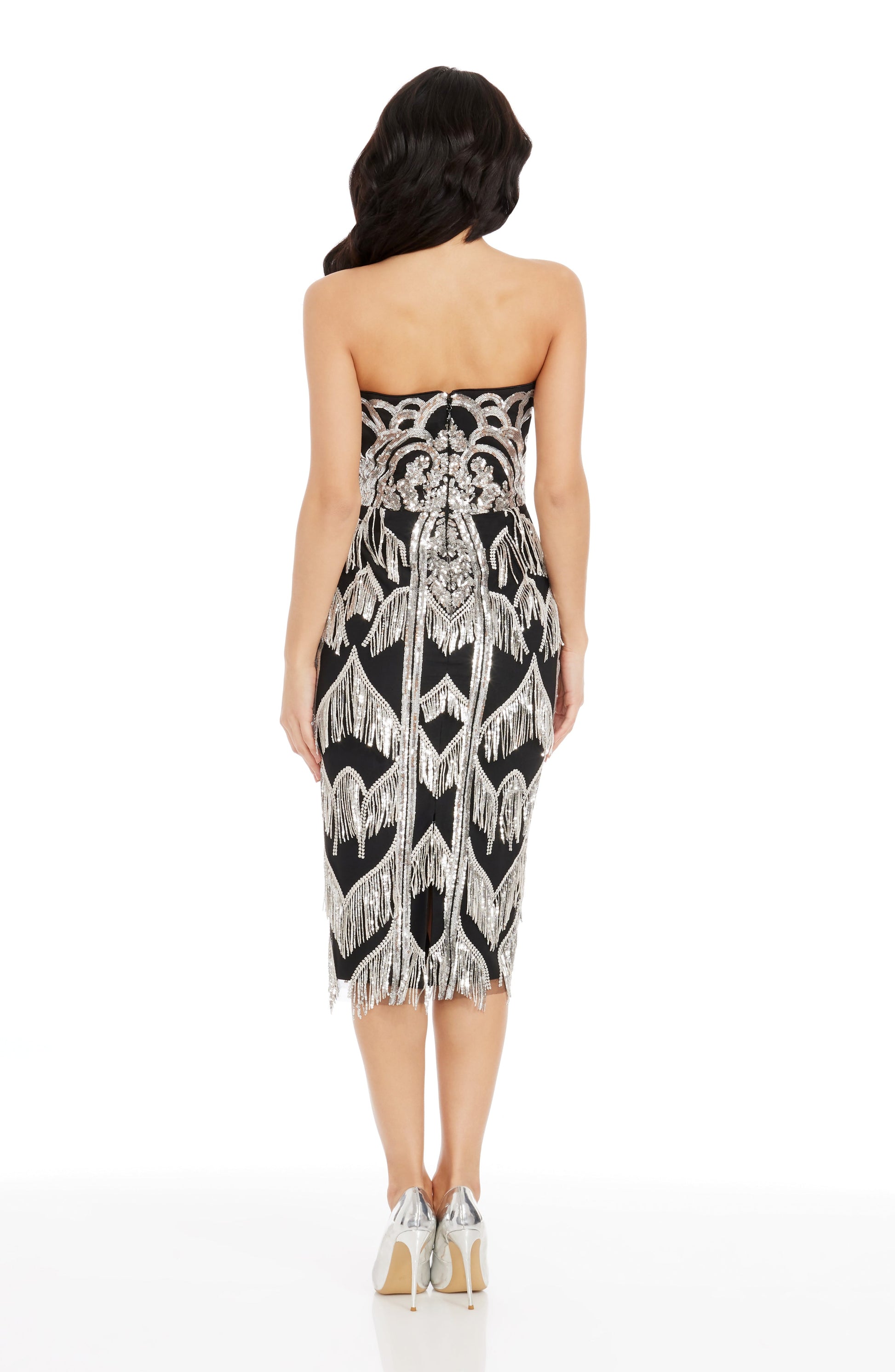 The Viviana is a captivating strapless bustier midi bodycon dress, adorned with fringe details that add a playful and elegant flair to your ensemble.