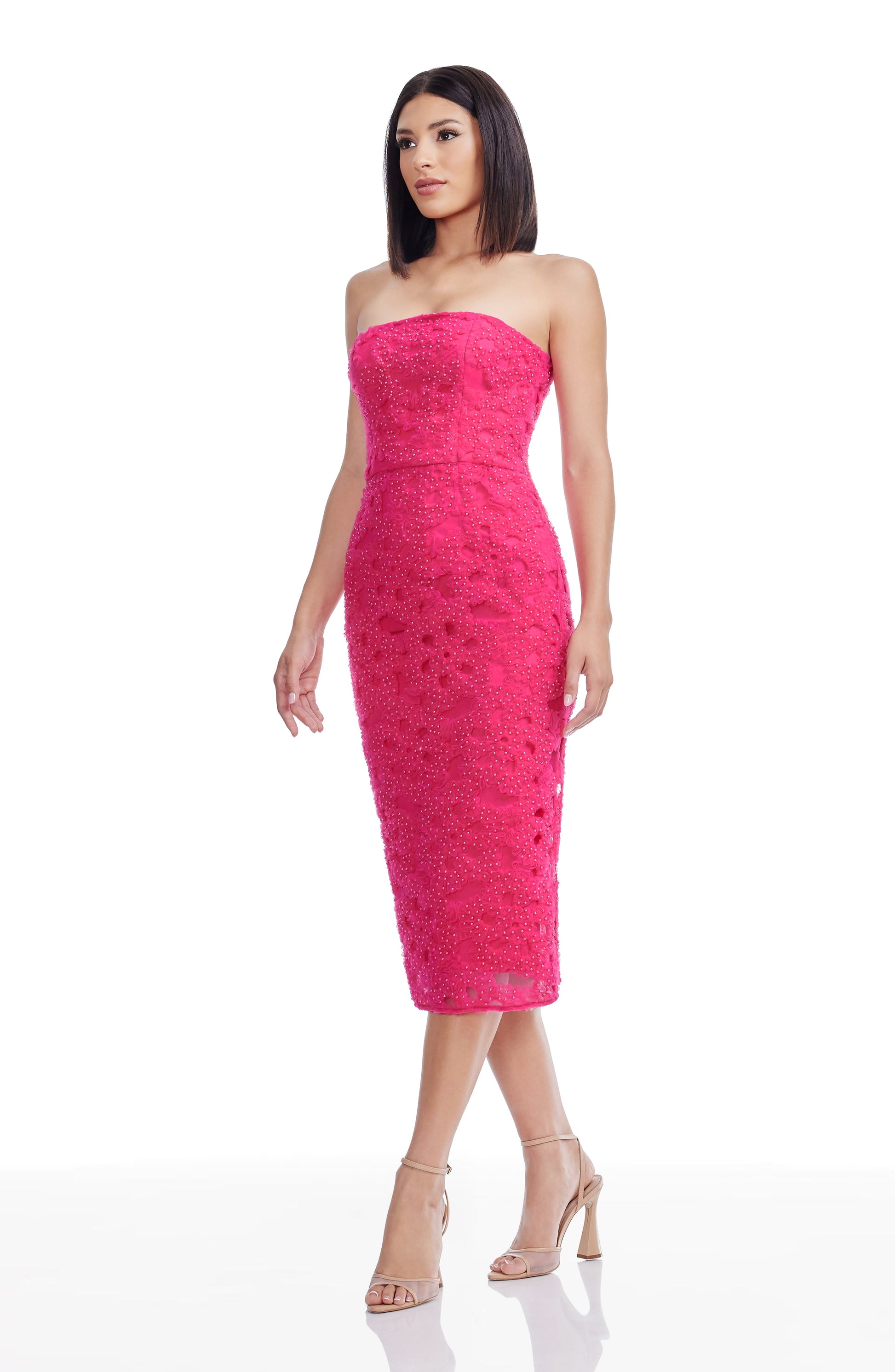 Bold, bright, and unforgettable—Viviana is a statement midi adorned with dimensional floral texture and soft feminine details.