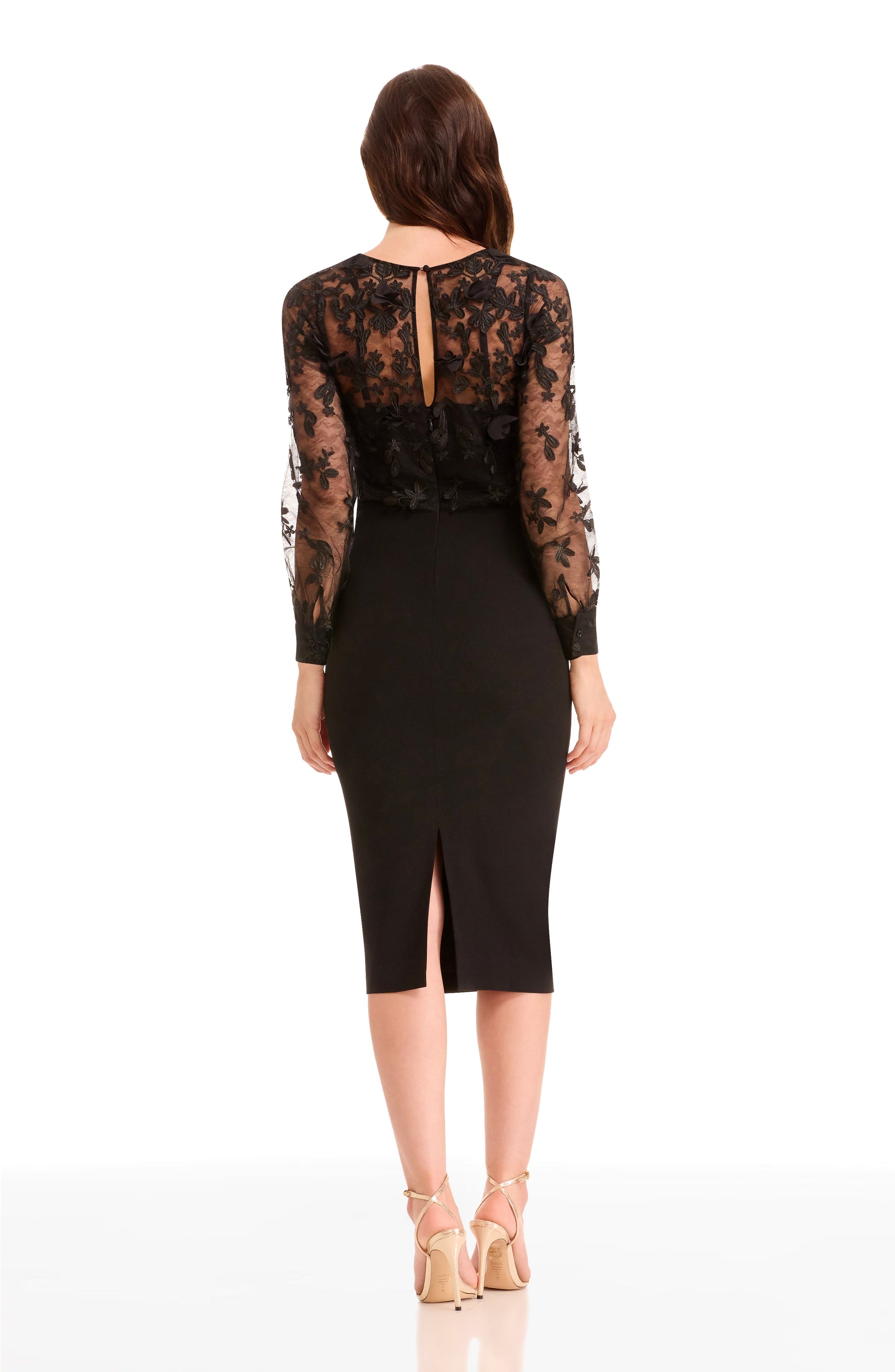 - Center back invisible zipper with keyhole and button closure