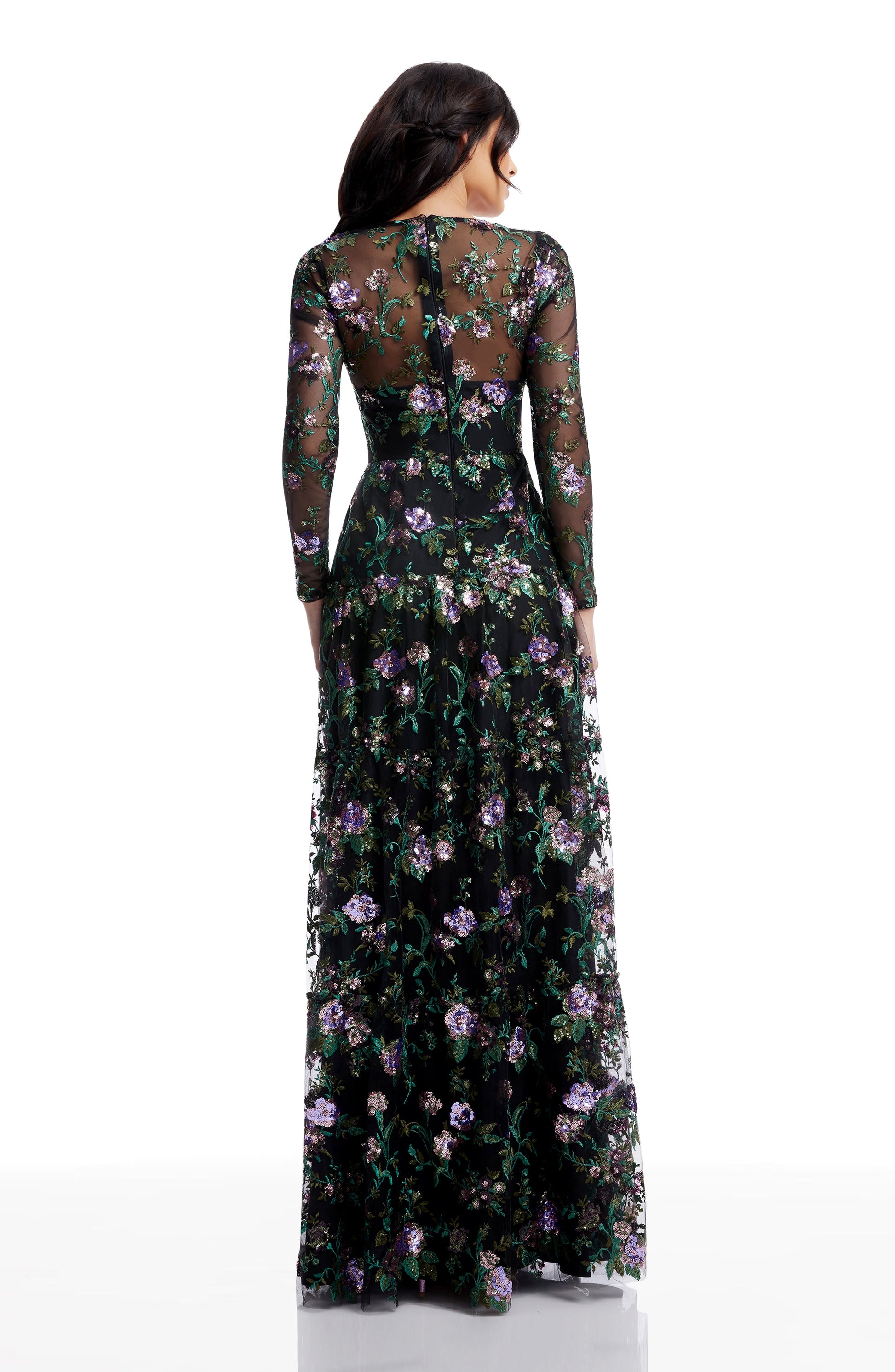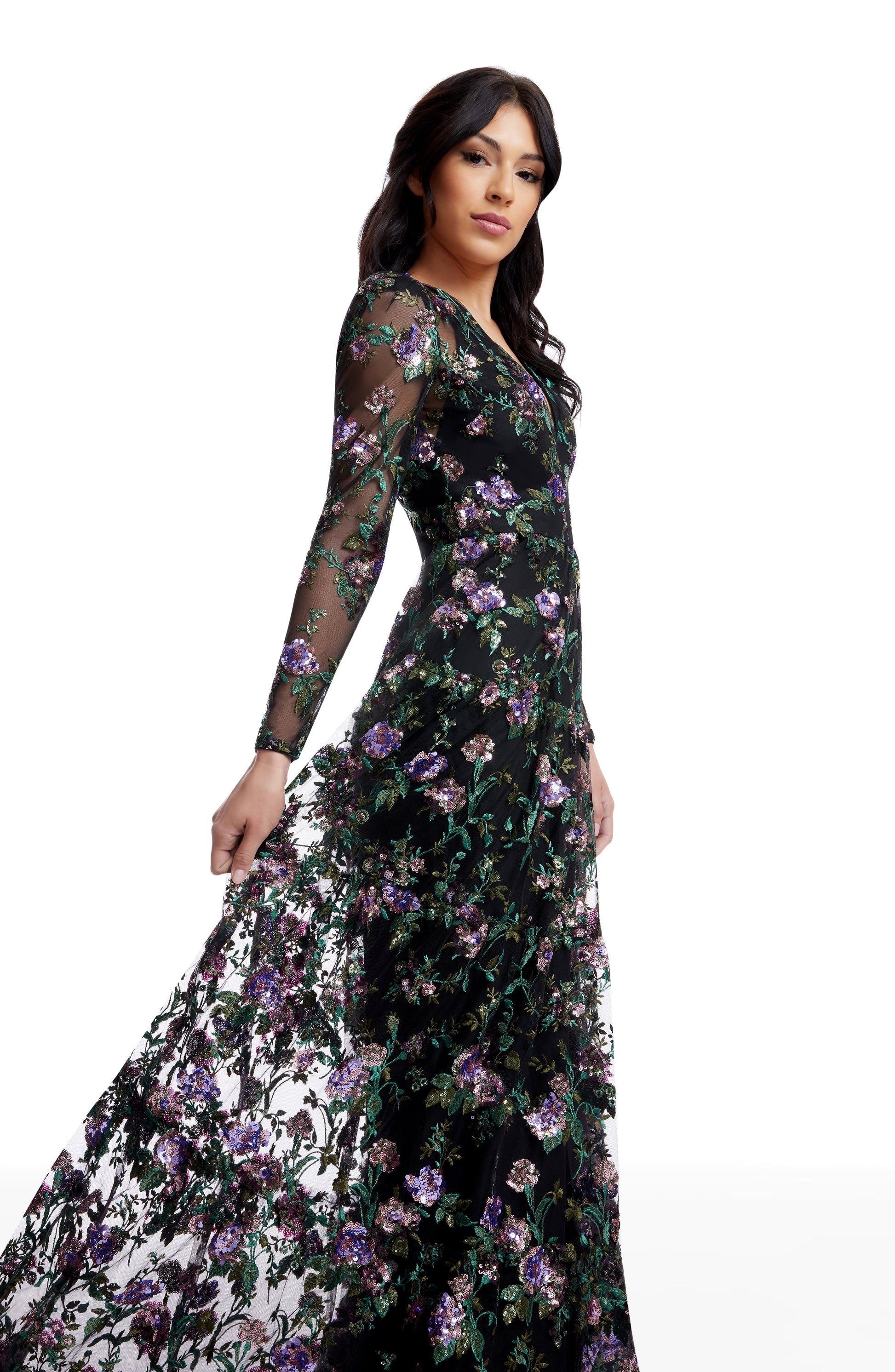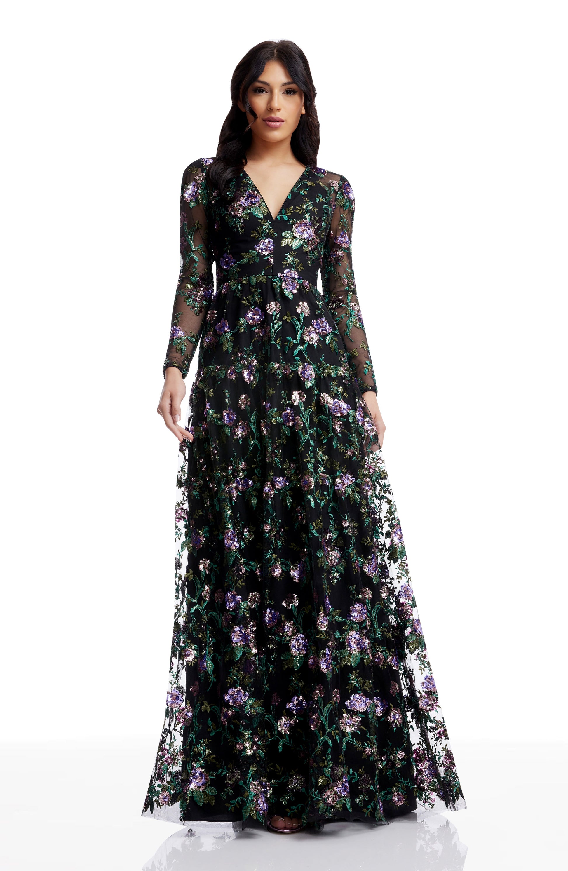 The Angelina Dress features long blouson sleeves and a flattering fit and flare silhouette, with a stylish v-neckline.n