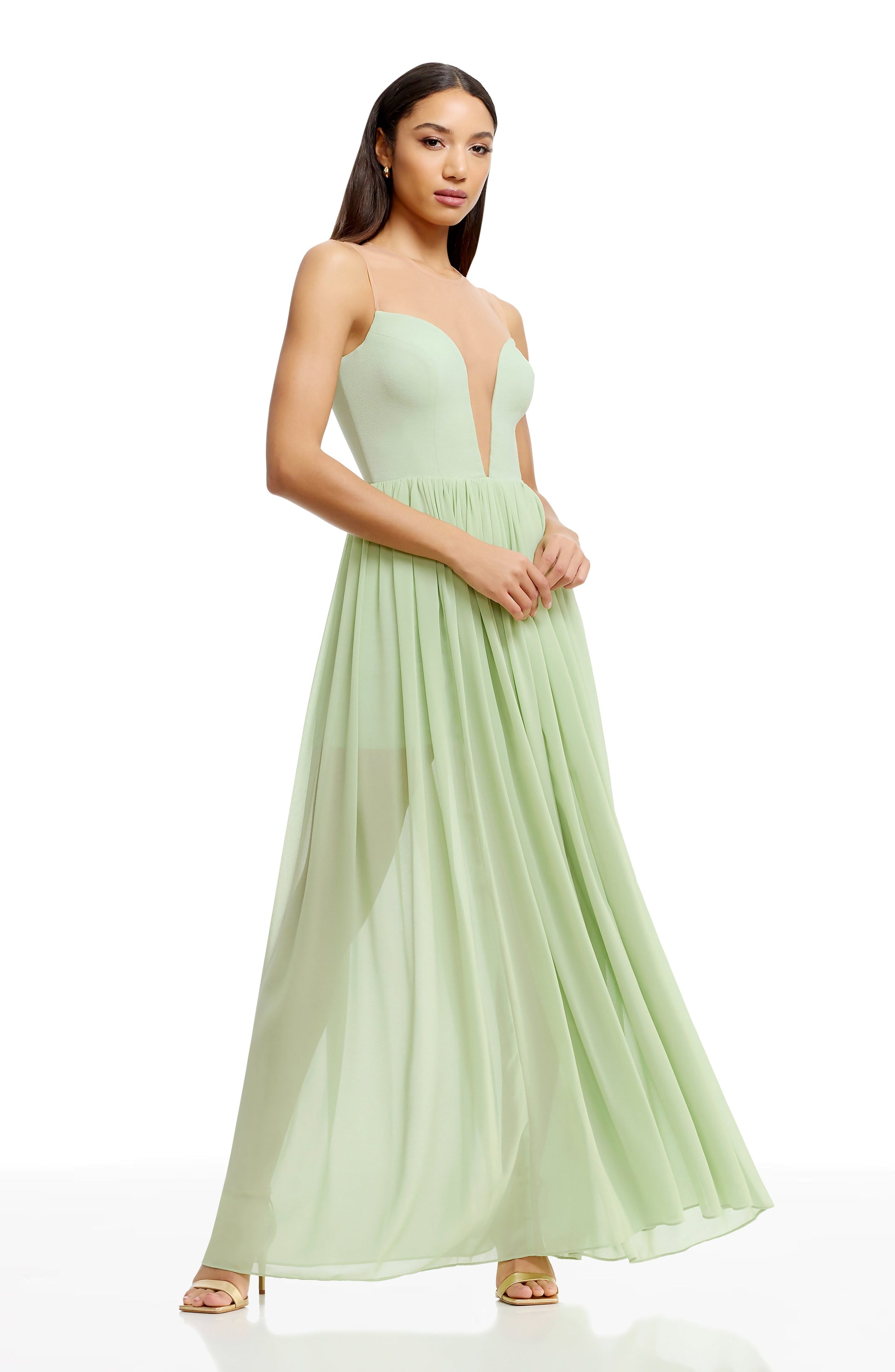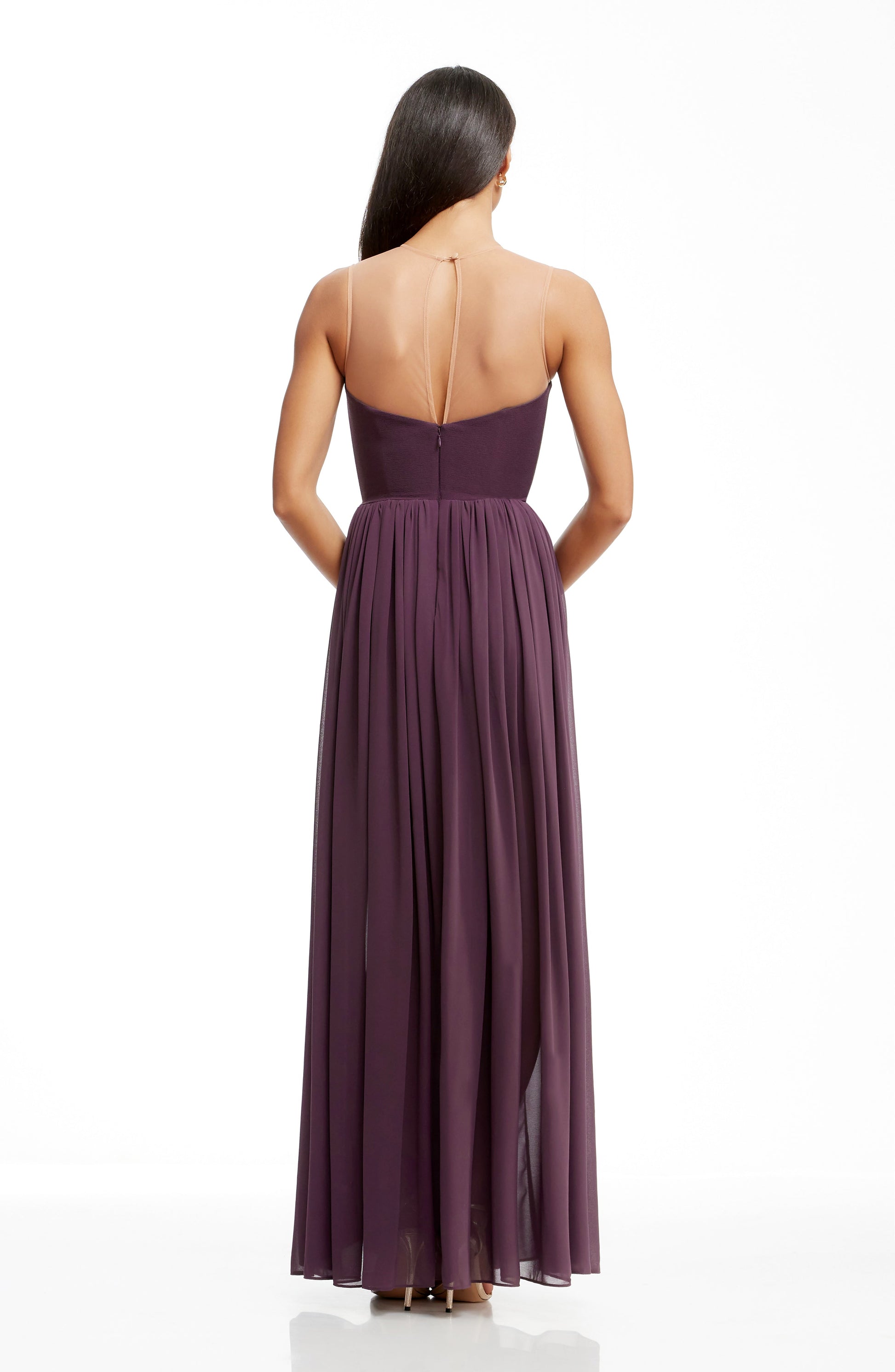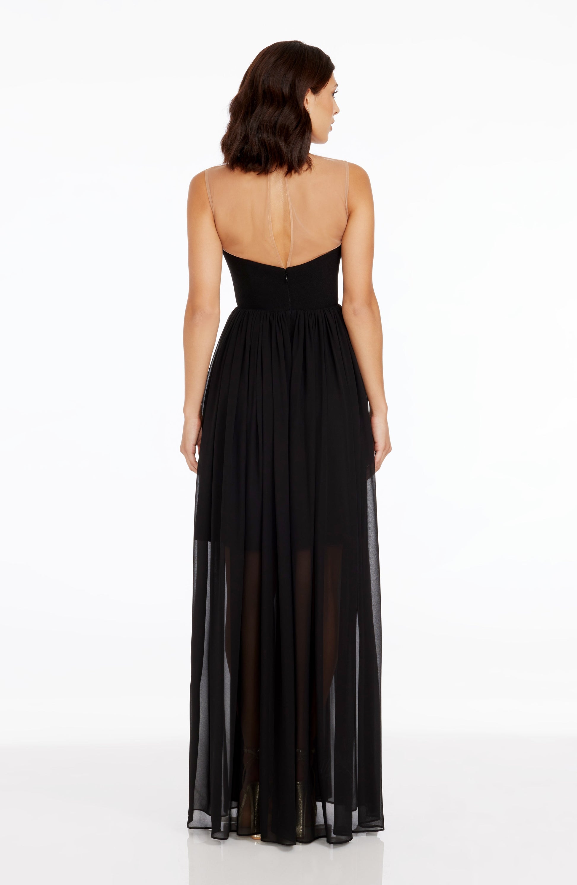 - Sheer mesh insert at neckline for faux-strapless look