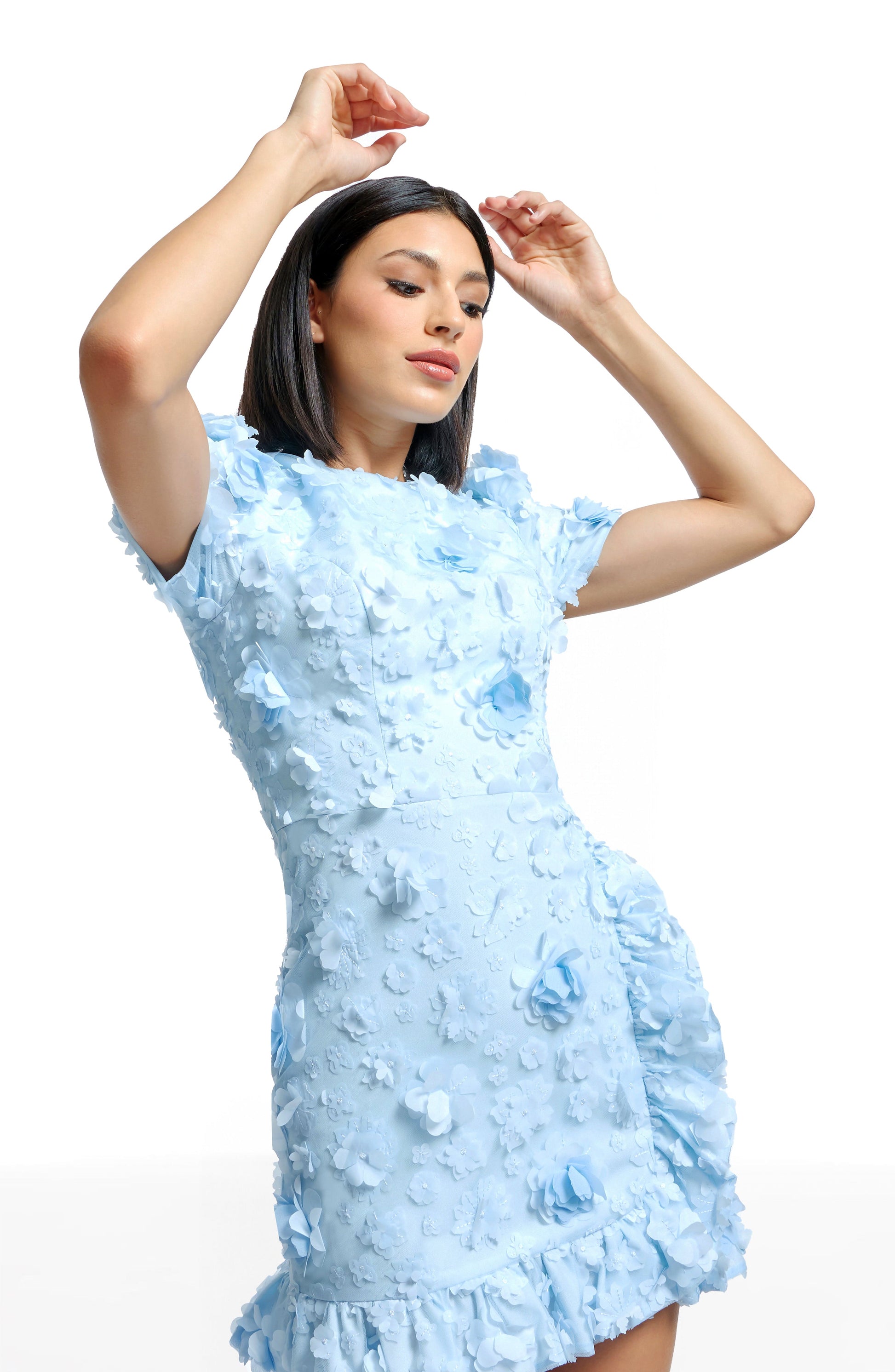 - 3D flowers are hand-placed and the design features a ruffle detail at the hem