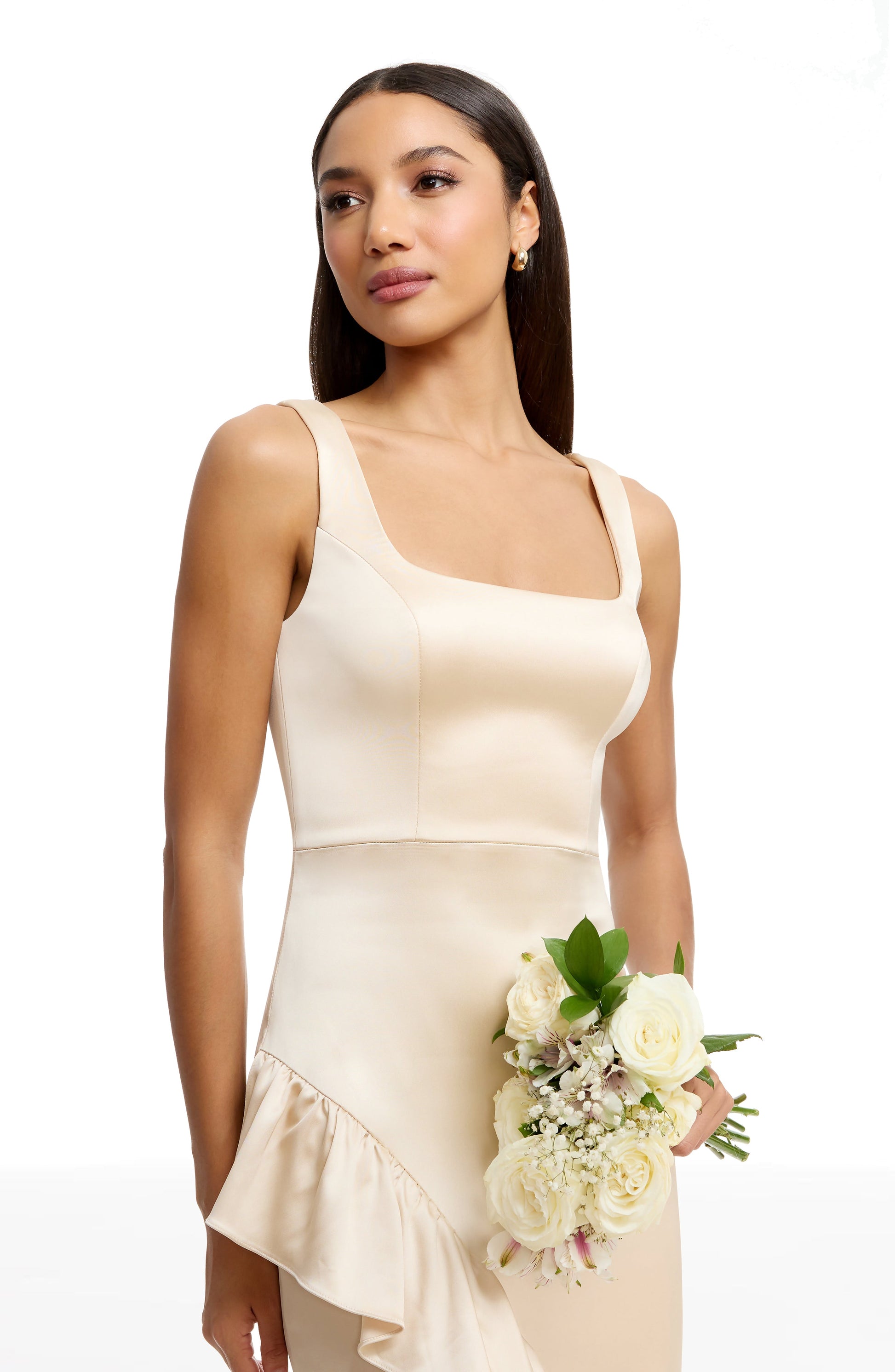 This Charlene Gown features a sleeveless design with a square neckline, creating a body-conscious silhouette. Its asymmetrical ruffle and mermaid gown style give it an artistic touch, perfect for those who appreciate elegant fashion.