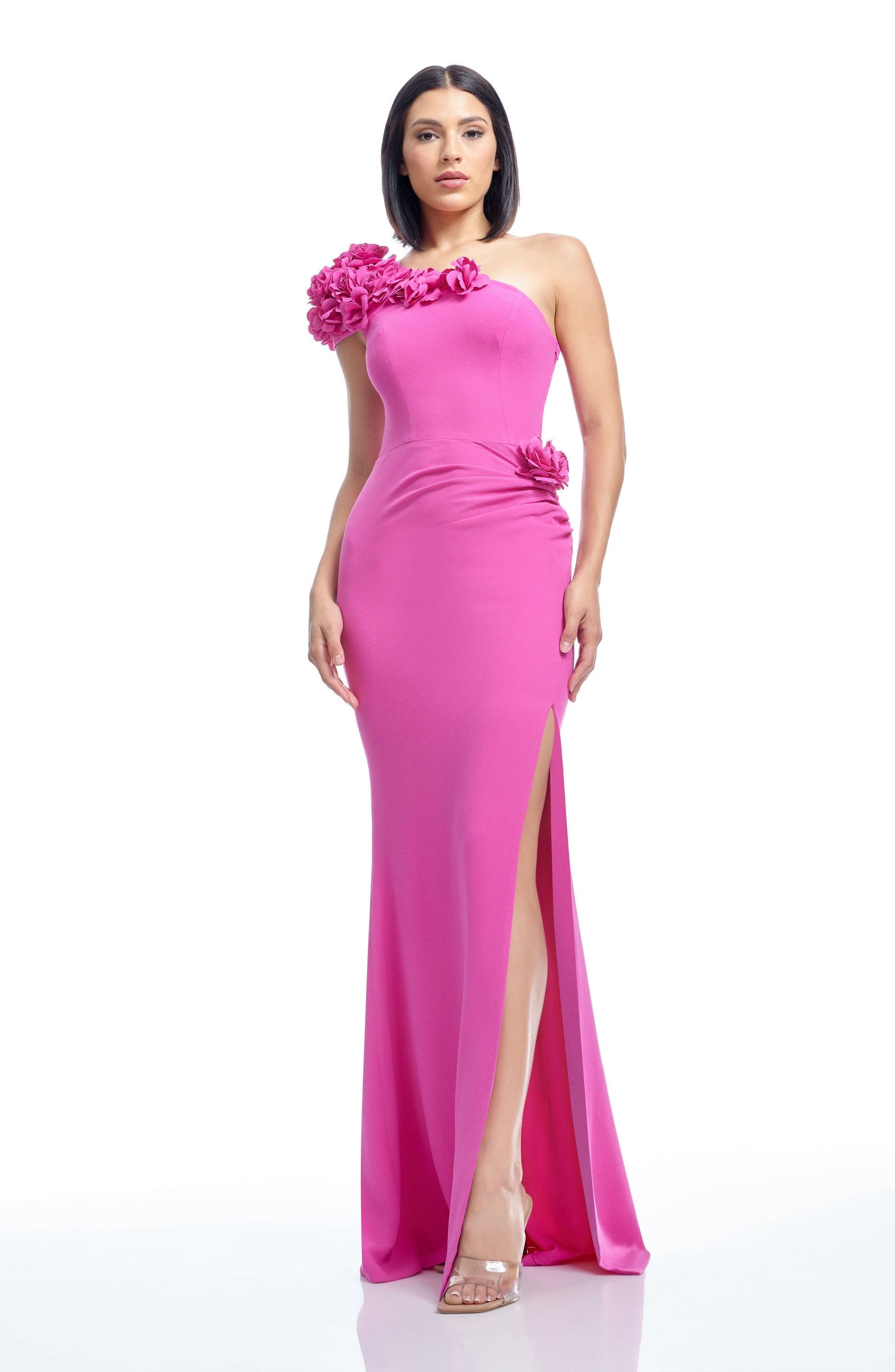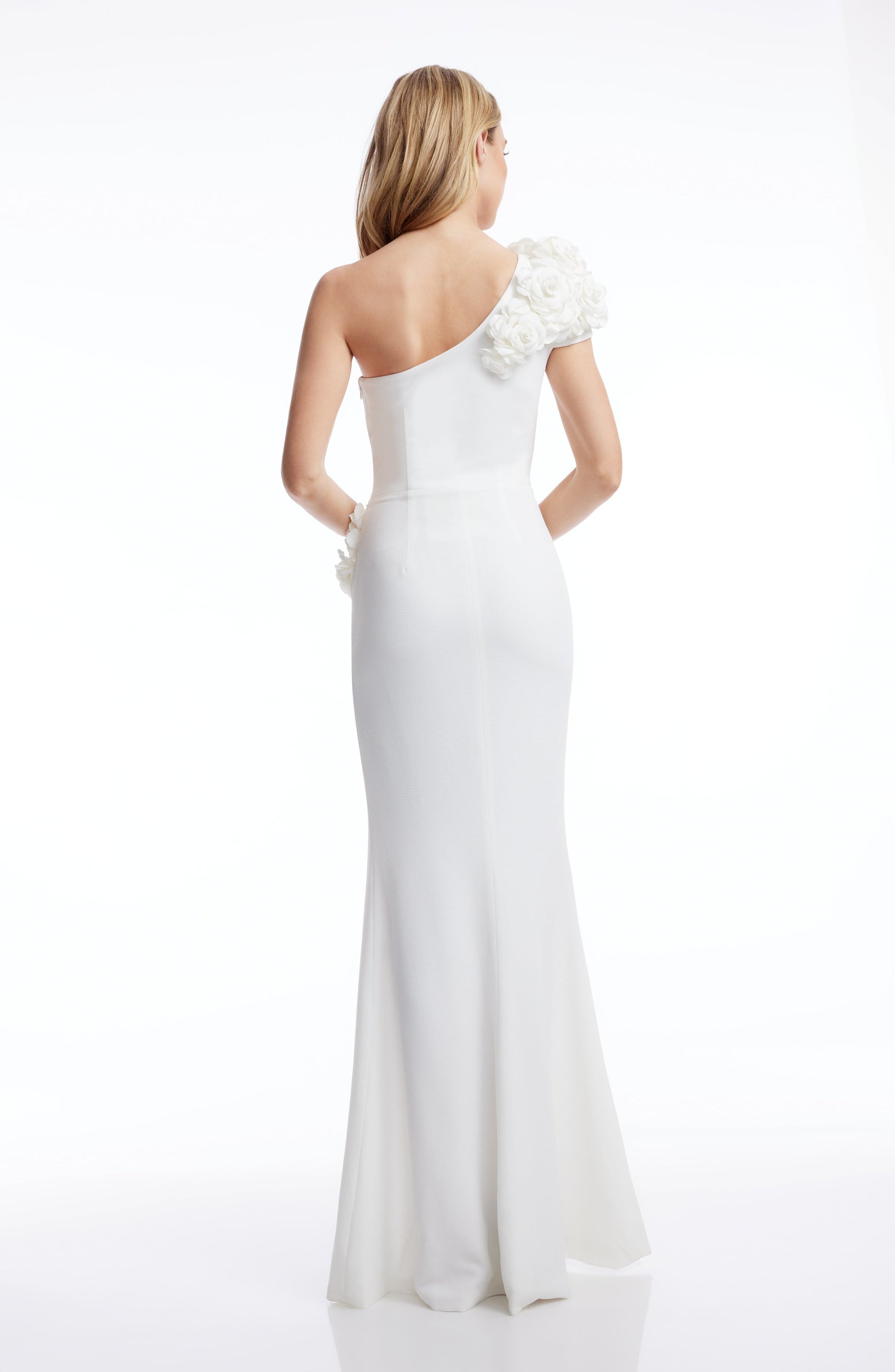 Aubrielle is a romantic reimagining of structure and softness—crafted in 3053 crepe with delicate hand-set 3D florals and a sculptural one-shoulder neckline.