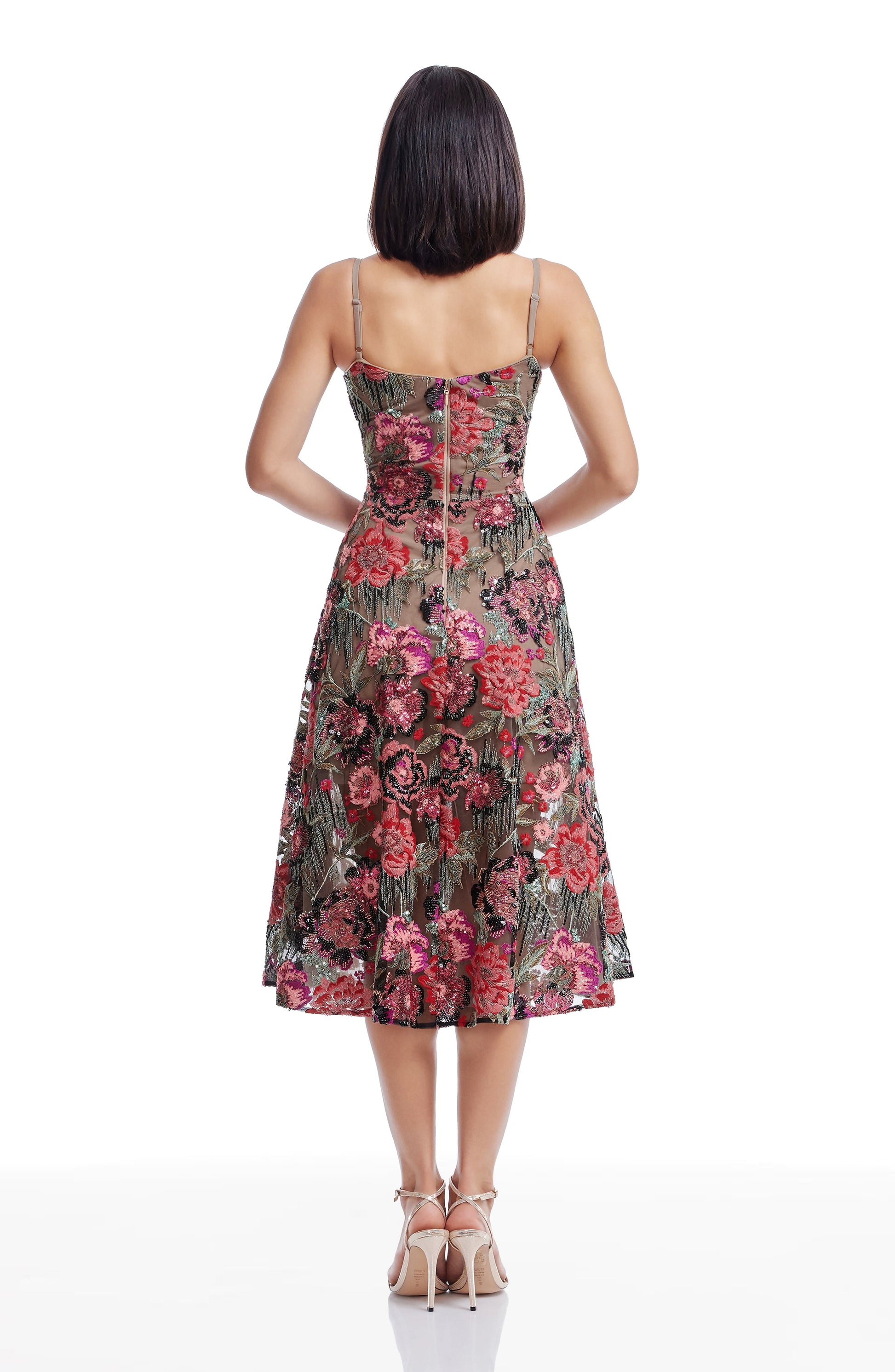 Uma is a modern romantic—an airy A-line midi with shimmering embroidered sequins and a soft, stretchy lining that moves with you.