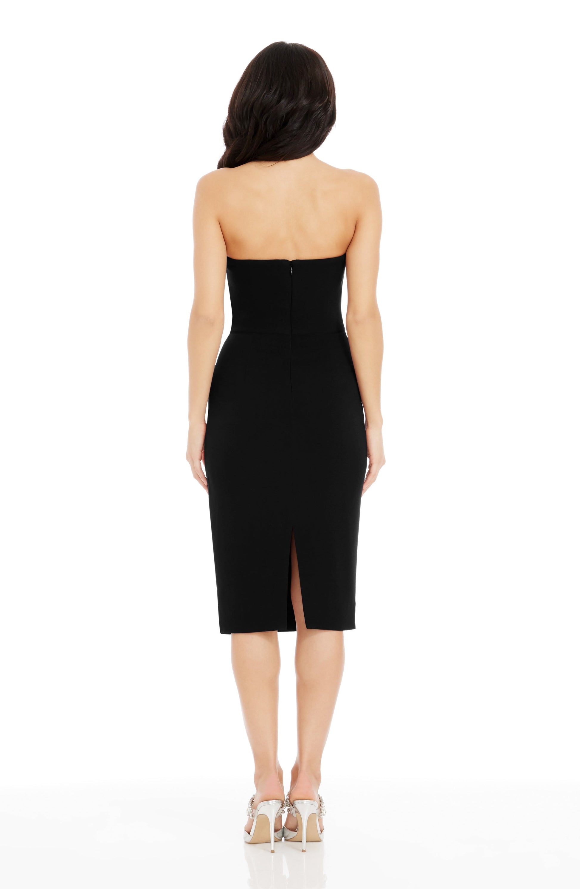 - Strapless bodycon dress with exaggerated pointed asymmetrical neckline and straight back