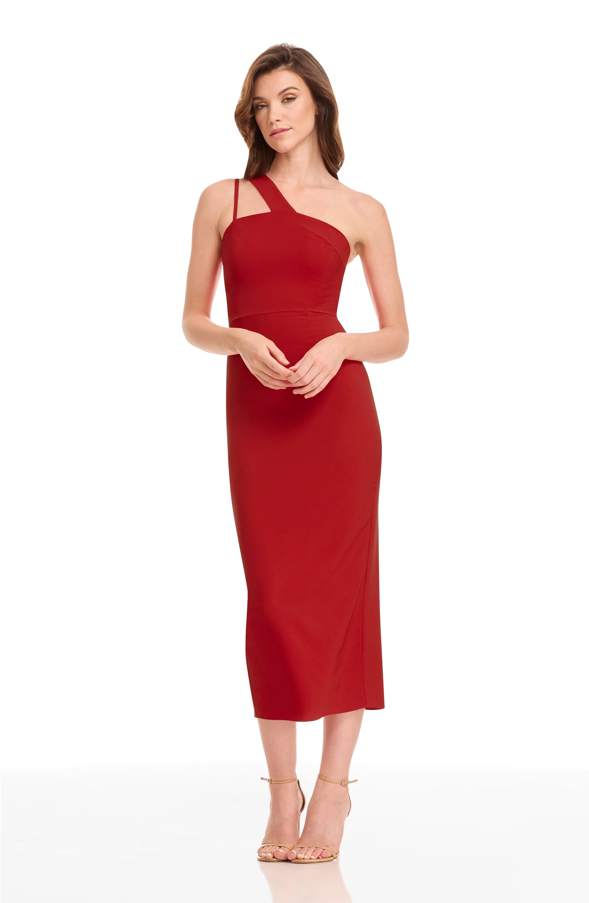 Sculpted sophistication meets modern asymmetry. April features a body-hugging tea-length silhouette in our lightweight stretch crepe, with an asymmetrical neckline and two unique straps.