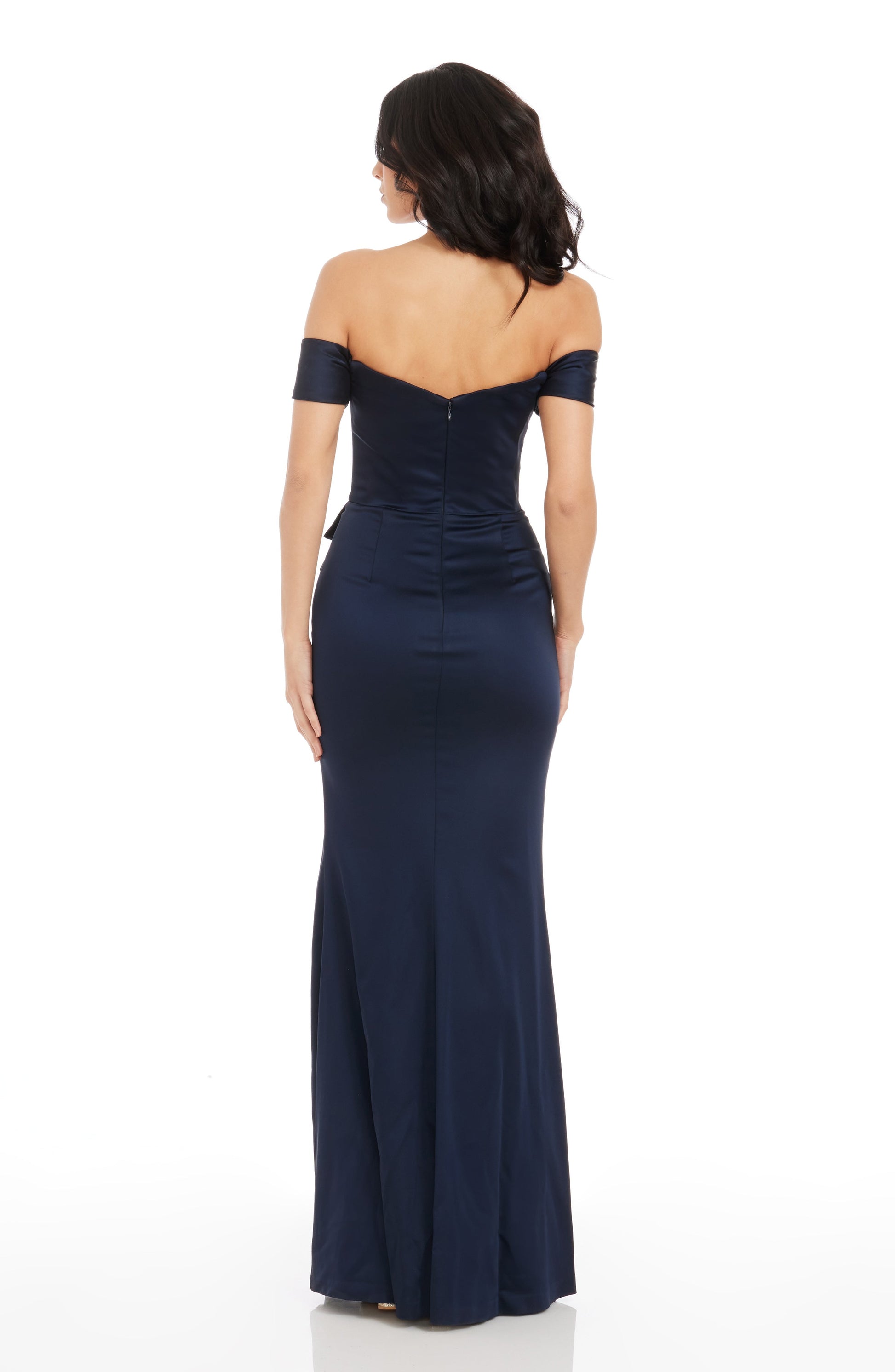 Featuring an asymmetrical drape construction, this sleek, off-the-shoulder gown highlights your silhouette while providing a flattering fit. Ideal for formal occasions, this gown is sure to elevate your style.