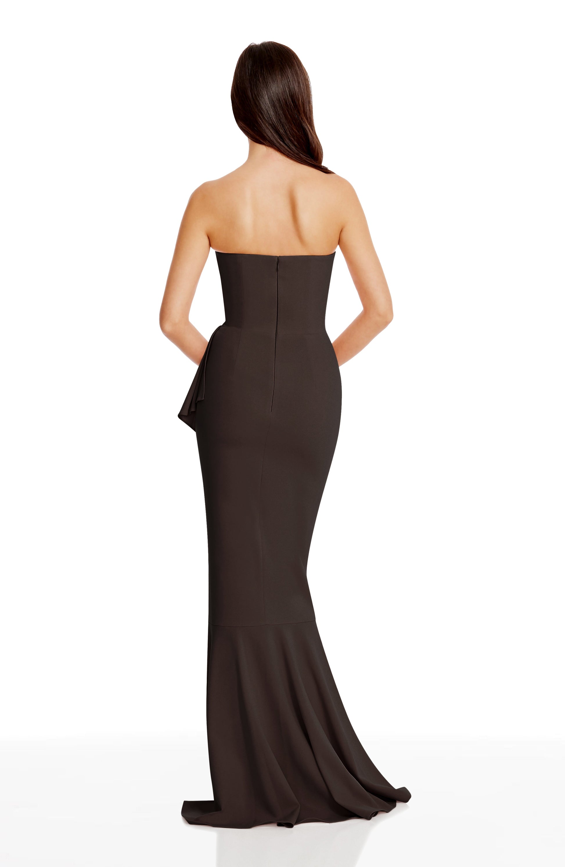 There’s nothing more magical than a night in Paris, and this dress perfectly encapsulates the beauty of Parisian elegance. The dramatic ruffle cascading down the side of the skirt is brilliantly balanced with the mermaid silhouette, and the pleated detailing on the top creates an even more enchanting appearance.